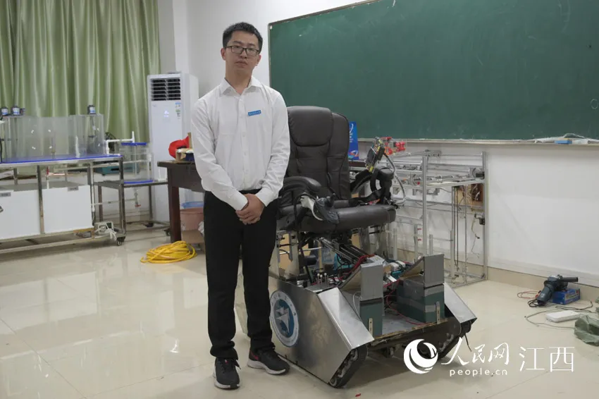 刘鑫和他与团队设计的智能爬楼轮椅 ( 刘起福/摄)