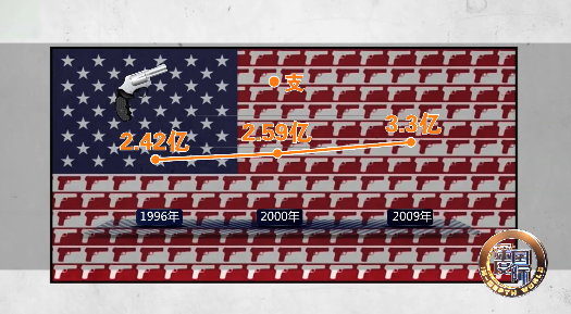 惨剧背后则是美国的枪支销量节节攀升。根据美国联邦调查局5月4日发布的数据显示,今年前四个月全美枪支销售量达到近1600万支,比去年同期猛增31%,创下自1998年有枪支销售纪录以来的新高。而另一份关于美国民间枪支持有量的统计结果同样惊人。1996年美国私人拥枪数量为2.42亿支,2000年为2.59亿支,2009年这个数字达到了3.3亿支,首次达到美国全国人口总量。而到今年,全美枪支保有量已接近4亿支。