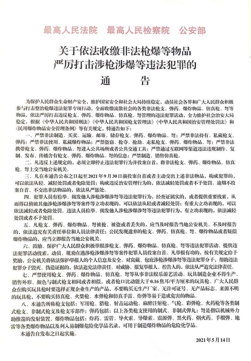 中国青年报客户端北京5月25日电(中青报·中青网记者 何春中)公安部今天召开新闻发布会,通报打击整治枪爆违法犯罪专项行动取得的阶段性成效,解读最高法、最高检、公安部《关于依法收缴非法枪爆等物品严厉打击涉枪涉爆等违法犯罪的通告》的主要内容(以下简称《通告》)。《通告》规定,凡在本通告公布之日起至2021年9月30日前投案自首或者主动交出非法枪爆等物品,构成犯罪的,可以依法从轻、减轻处罚或者免除处罚;