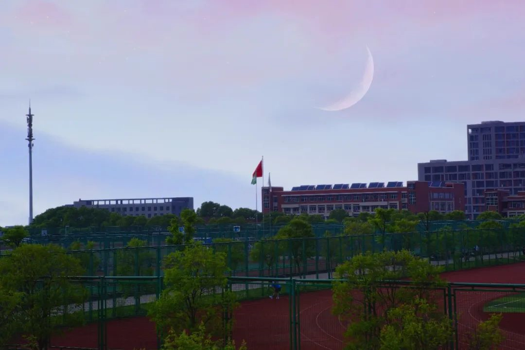 夜暮降临,落日踏着晚霞归去,整个校园沉浸在浪漫中,夜色交织,月亮勾勒出别样的风景。