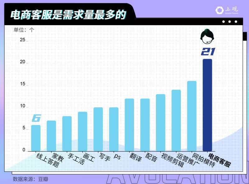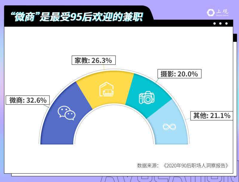 技术型工作中,电商客服需求量最大,也是最受年轻人欢迎的。根据《2020年90后职场人洞察报告》,约50%的95后有兼职,而微商的比重便占据了近1/3。