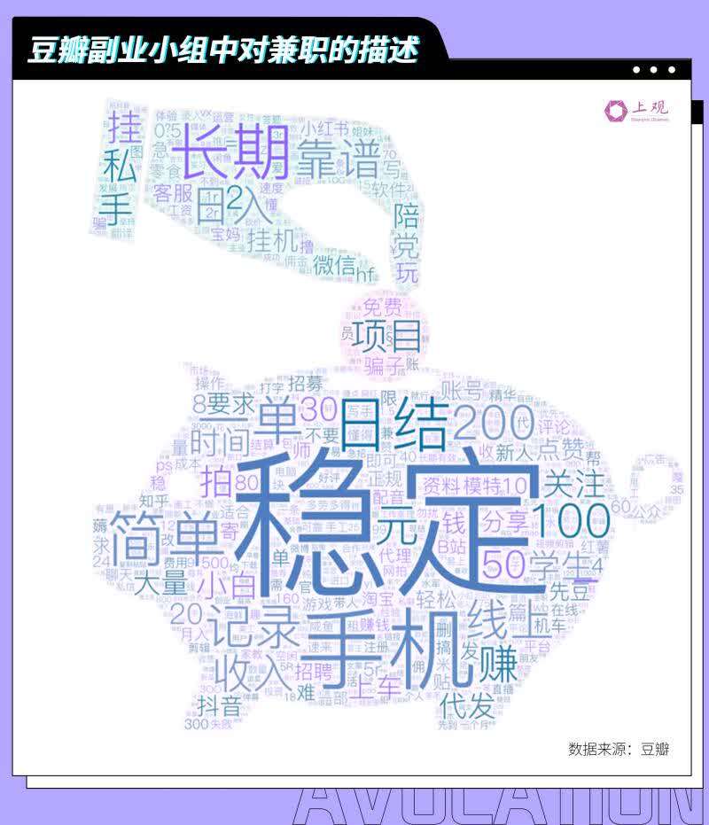 奇怪的是,虽然日结工作无法带来较多的收入,但在豆瓣副业小组,对工作描述排第一位的词云居然是:稳定。“简单、自由、门槛较低”的特点,也吸引了不少网友。