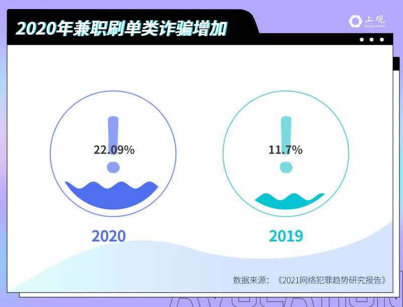 根据《2021网络犯罪趋势研究报告》显示,2020年,“兼职刷单诈骗”是较为高发的诈骗类型,占网络犯罪总数的22%,仅次于“信贷类诈骗”,排名第二。并且,相较于2019年,增幅较多,增加了近11%。