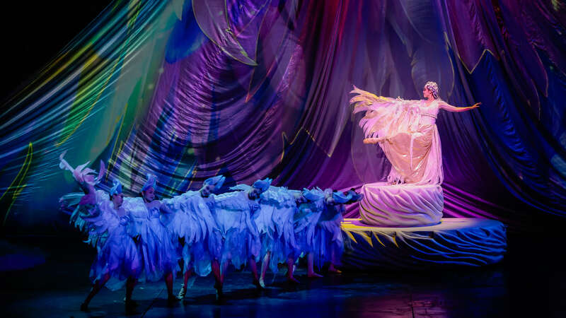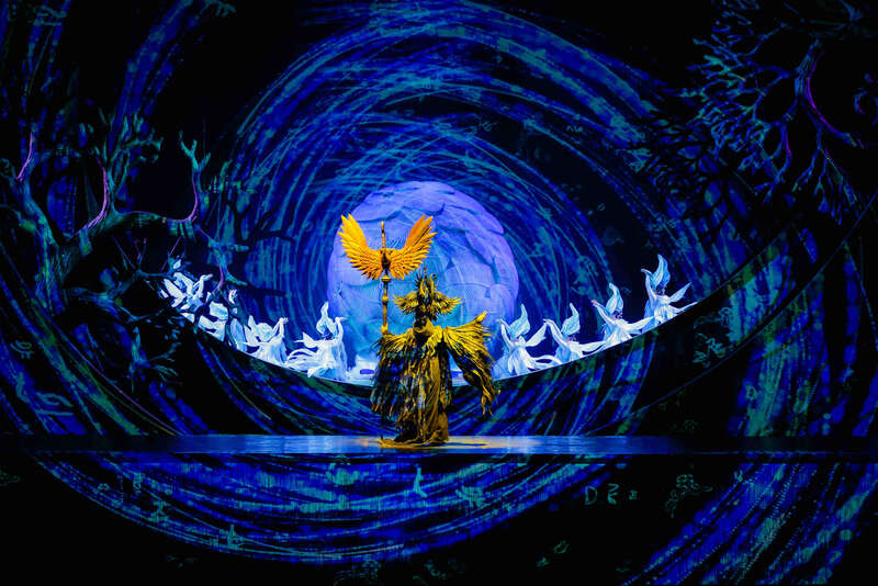 舞台上,两位主人公——《山海经》中的“比翼鸟”和“文鳐鱼”翩跹起舞,服化造型色彩明艳,道具设计充分融合了三星堆元素,如青铜神树、太阳鸟、青铜纵目面具等。再结合多媒体人屏互动、数百吨洪水席卷舞台、多重纱幕等舞台效果,观众评价“仿佛走进了上古世界”“新奇吸睛”“视觉层次丰富”。