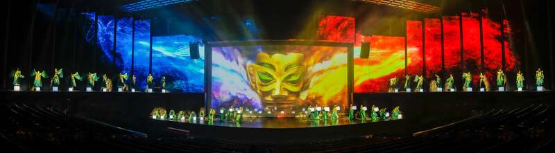 杨乐介绍,本次《金面王朝》升级改造后的表演使用了400余盏舞台灯具,686平方米P3高清4kLED屏幕,4台3w1k流明3LCD高清投影仪,打造180度沉浸式舞台。但相对于表现形式,杨乐认为更重要的是这个秀的内核,也就是传统文化,“技术是为内容、为文化本身服务的。”