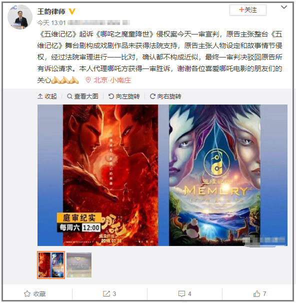 如今,经过长达一年多的调查,最终一审判决驳回了原告,《哪吒之魔童降世》方获得了一审胜诉。在一审结果面前,虽然《五维记忆》的版权方最终被打脸,但不排除当然目前只是一审胜诉,不排除《五维记忆》还会继续上诉。