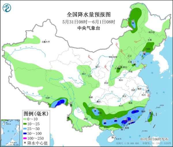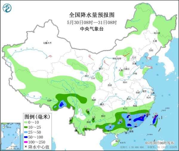 预计今明两天(5月30日至31日),南方强降雨的主雨带将会逐渐南落,华南地区将进入多雨时段,局地甚至有大暴雨出现,公众需做好防范工作,警惕强降雨可能引发的次生灾害。此外,今天起,北方大部地区自西向东将有一次大风天气过程,大部地区风力有4~6级,部分地区阵风可达7~8级,提醒公众外出时需注意防风。