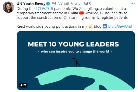 郭硕在秘书长青年问题特使的推特宣传中国青年志愿者吴正亮的故事