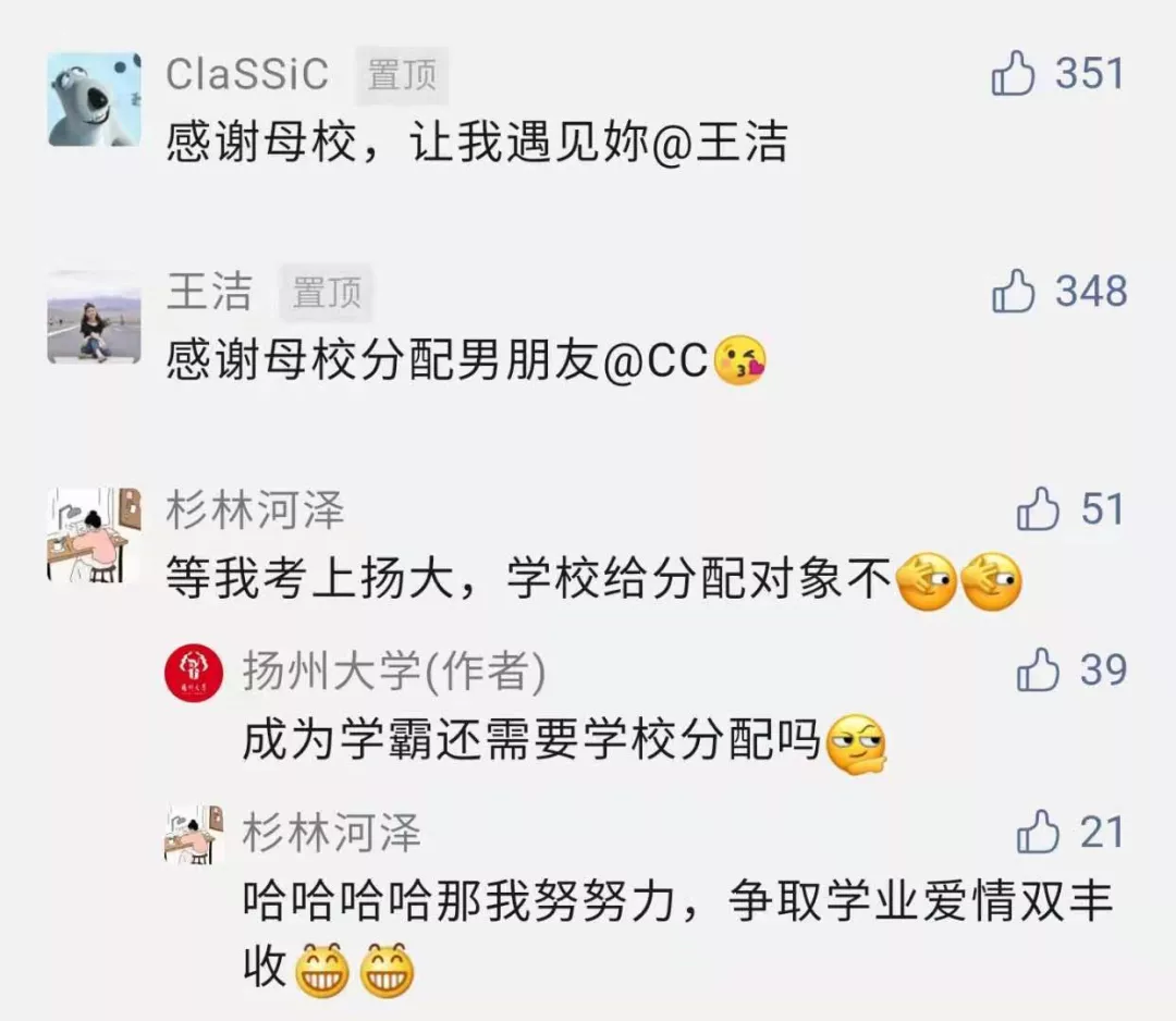 王洁表示,感谢母校分配男朋友。陈诚表示,感谢母校,让我遇见你。