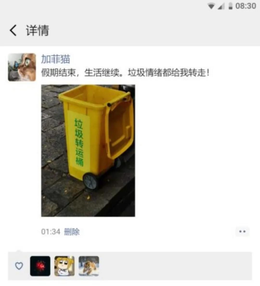 我不会删除朋友圈。我更倾向于把它当作我情绪的记录,类似于把朋友圈当作我的树洞。