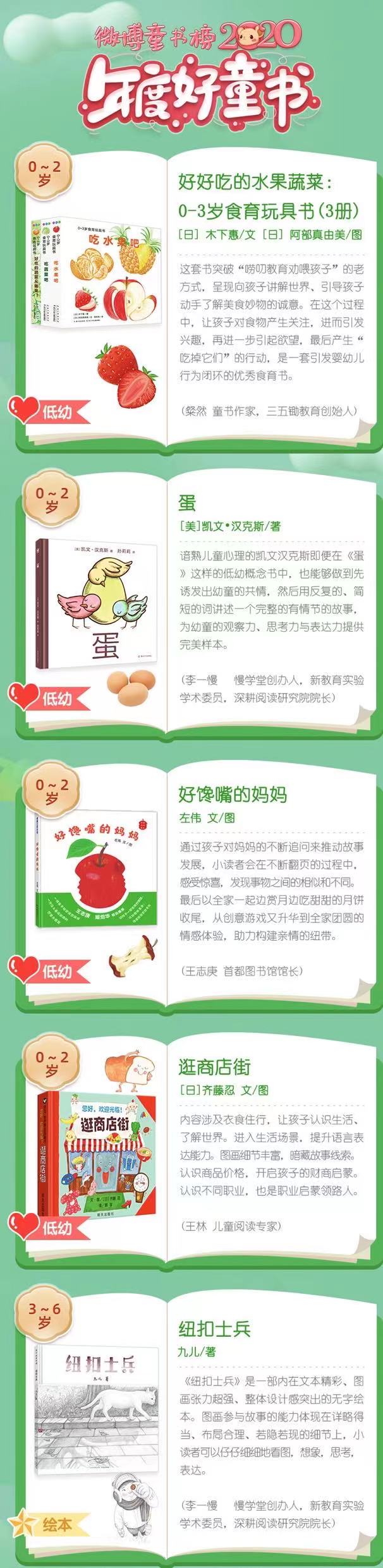中国青年报客户端讯(中青报·中青网记者 蒋肖斌)“微博童书榜2020年度好书”于近日揭晓,入选的好书有《好好吃的水果蔬菜:0-3岁食育玩具书》《好馋嘴的妈妈》《从前有个筋斗云》《敦煌:中国历史地理绘本》等共计30本。