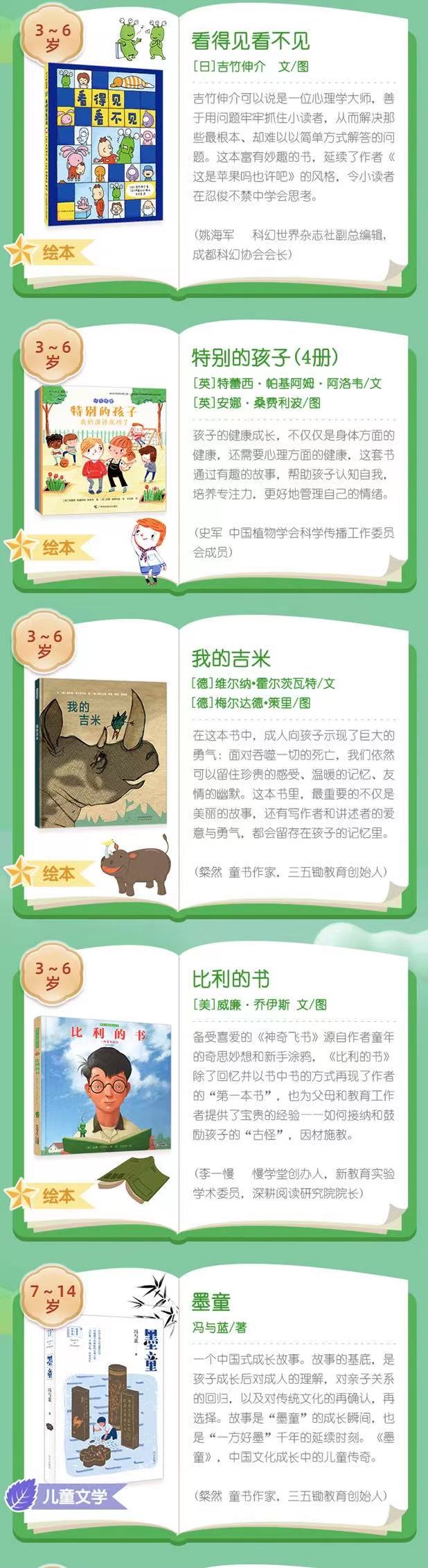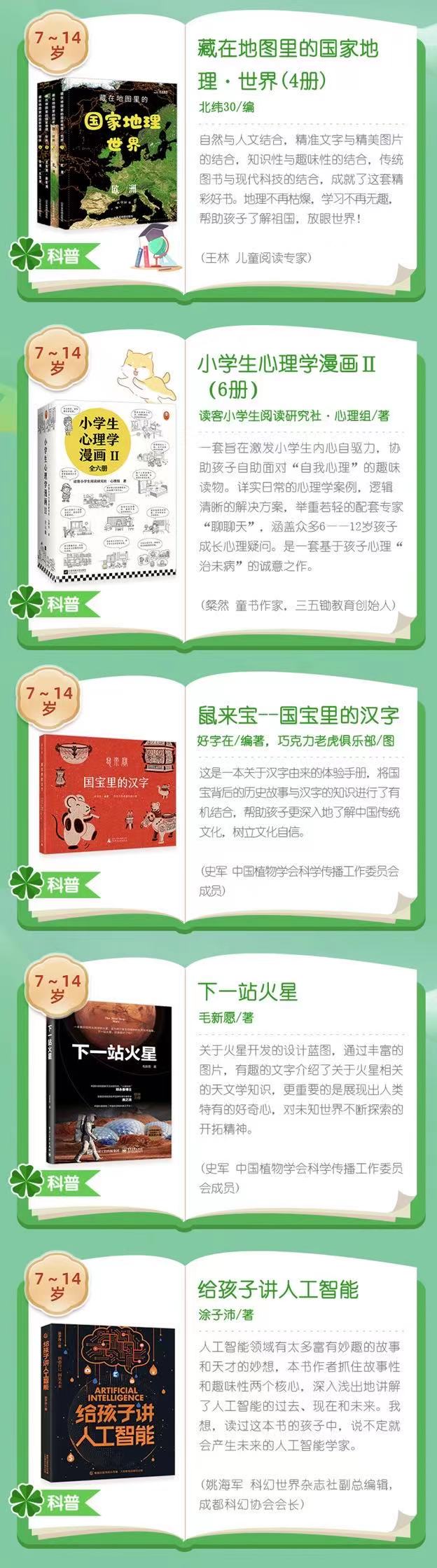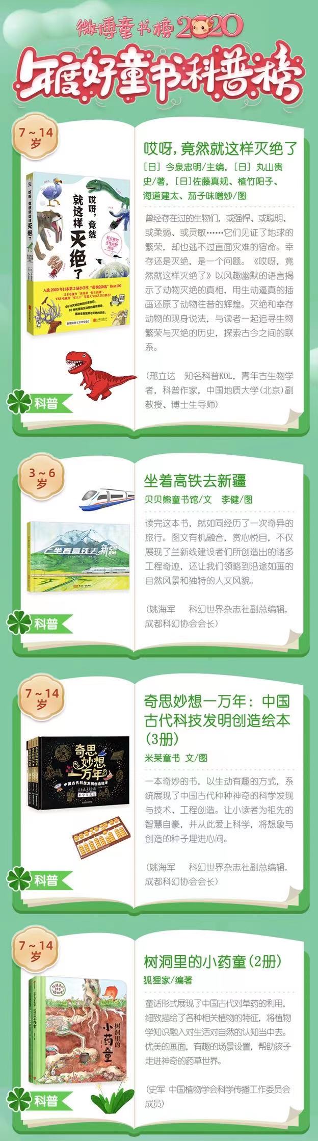 在今年新增的科普榜单中,既有讲述动物灭绝真相的《哎呀,竟然就这样灭绝了》,也有通过故事帮助孩子走进神奇药草世界的《树洞里的小药童》;不仅有展现古代科技的《奇思妙想一万年:中国古代科技发明创造绘本》,也有讲述现代科技工程奇迹的《坐着高铁去新疆》;还有展现人类探索精神的《下一站火星》,帮助孩子了解未来的《给孩子讲人工智能》。