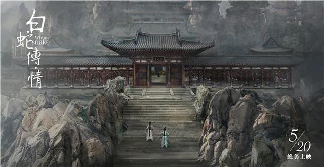 从场景布置到服装设计,《白蛇传·情》对比舞台上的戏曲演出,“实体化”非常明显,但又不是完全用电影的方式布景取景。例如剧中的城镇,小桥流水,白墙黛瓦,构筑出江南水乡的风貌。但实景之外又虚化了远景,用影影绰绰的方式消解了现实感,予人水墨画一般的质感。很多观众都提到片中“水漫金山”一段,白素贞与小青站的礁石和水面很真实,却通过颜色贴近水墨感,远处群山壁立更是虚化写意。特效制作的巨浪翻涌,仍采取这样的色调,让滔天巨浪既有真实感,也有水墨流淌的飘逸感,观众评价“声势更在画面外”,甚至有人看出了“二次元感”。