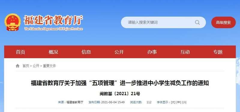 6月4日,福建省教育厅发布《关于加强“五项管理”进一步推进中小学生减负工作的通知》。