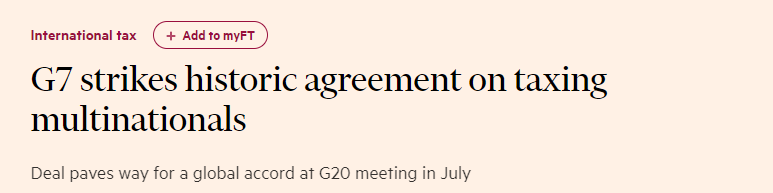 《金融时报》5月份曾报道称,如果各国财长能达成非正式协议,那么G7领导人可能在G7峰会上正式签署该协议,以便向根据经合组织(OECD)的“全面框架(inclusive framework)”进行磋商的135个国家提交一份计划。“这可能导致一个世纪以来最大规模的国际企业税收改革。”