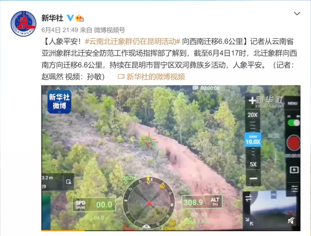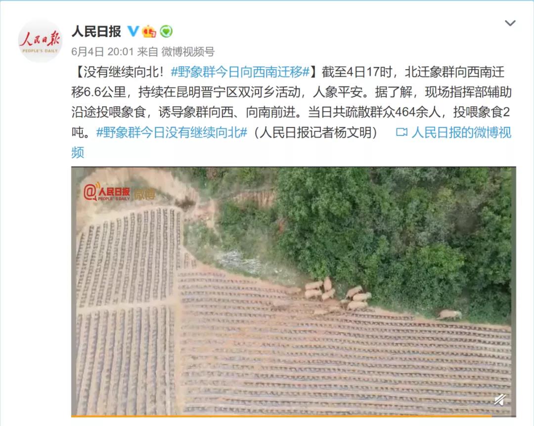 据人民日报、新华社报道,截至4日17时,北迁象群向西南迁移6.6公里,持续在昆明晋宁区双河乡活动,人象平安。