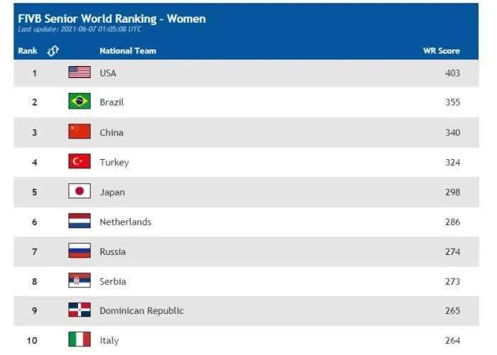 国际排联公布新世界排名 中国女排继续下跌至第三
