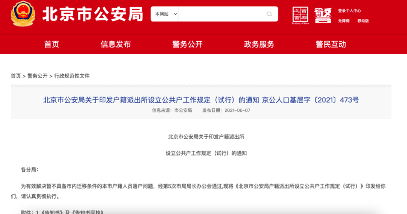 《规定》指出,北京全市每个户籍派出所原则上只设立一个非农业“公共户”,接收暂不具备市内迁移条件的本辖区非农业户口人员落户。