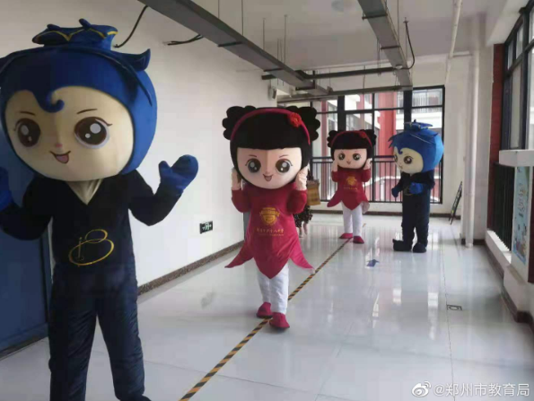 河南郑州18中校长等身穿学校吉祥物的玩偶服为高三学子送上祝福。 微博@郑州市教育局 图