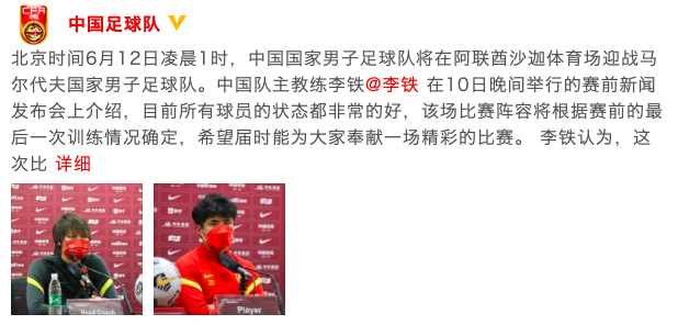 李铁在赛前发布会上表示首发阵容根据训练情况确定。中国足球队官方微博截图