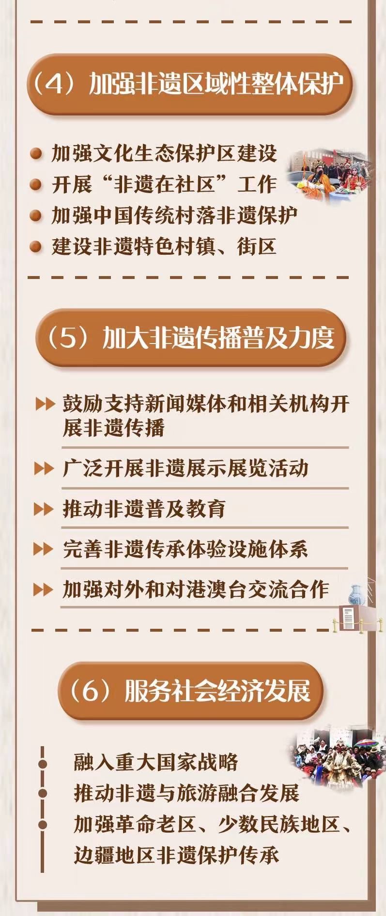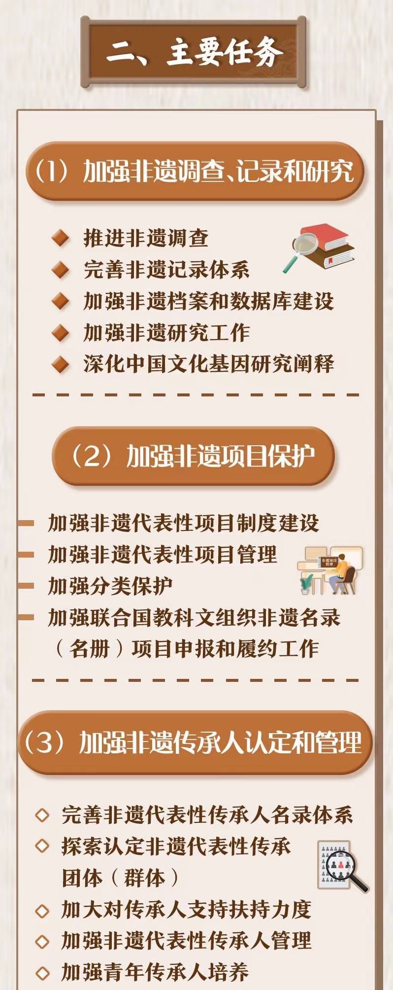 《规划》明确了加强非遗调查、记录和研究,加强非遗项目保护,加强非遗传承人认定和管理,加强非遗区域性整体保护,加大非遗传播普及力度和服务社会经济发展6个方面主要任务,并通过8个专栏对传统工艺高质量发展、文化生态保护区建设等重点工作进行了部署。