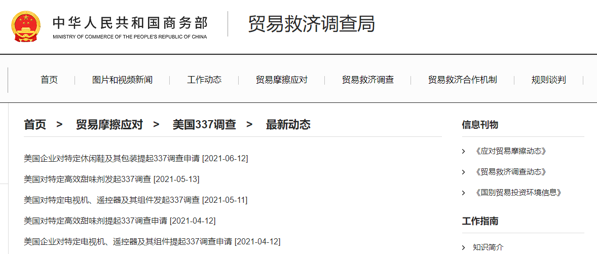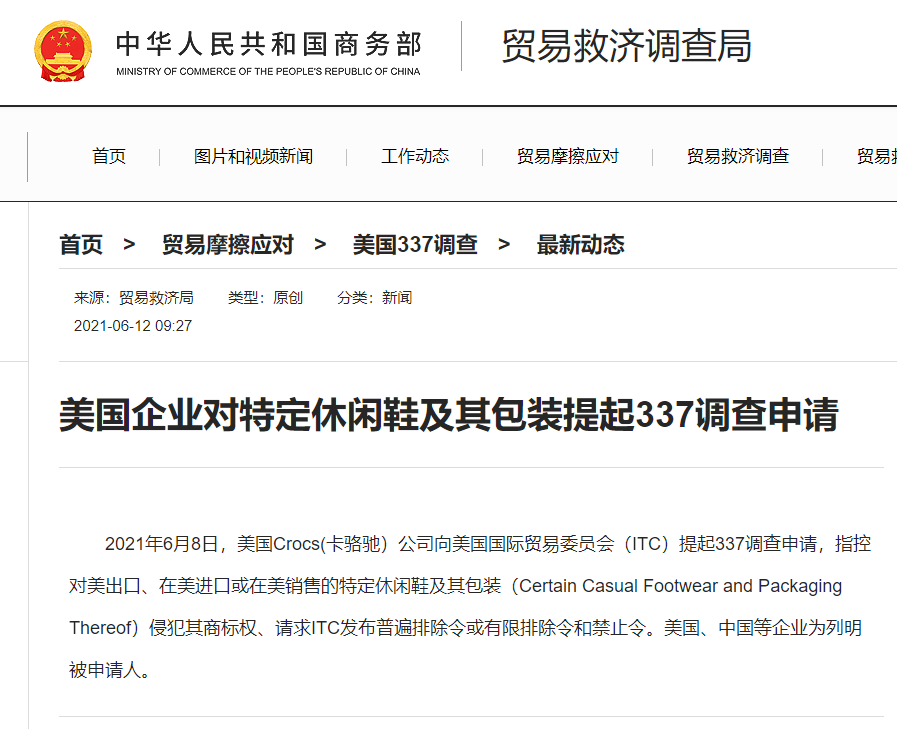 据商务部网站消息,2021年6月8日,美国Crocs(卡骆驰)公司向美国国际贸易委员会(ITC)提起337调查申请,指控对美出口、在美进口或在美销售的特定休闲鞋及其包装(Certain Casual Footwear and Packaging Thereof)侵犯其商标权、请求ITC发布普遍排除令或有限排除令和禁止令。美国、中国等企业为列明被申请人。