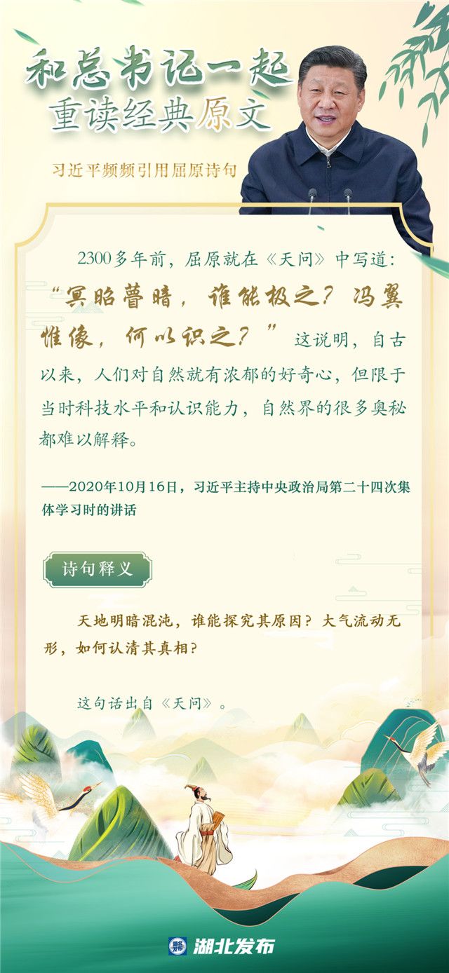 党的十八大以来,习近平总书记曾在不同场合多次提到屈原,赞叹其心忧家国、情牵百姓、勇于探索、清正高洁的人格魅力和思想精髓,并几度引用屈原诗歌中的名句来阐述思想,寄情言志。
