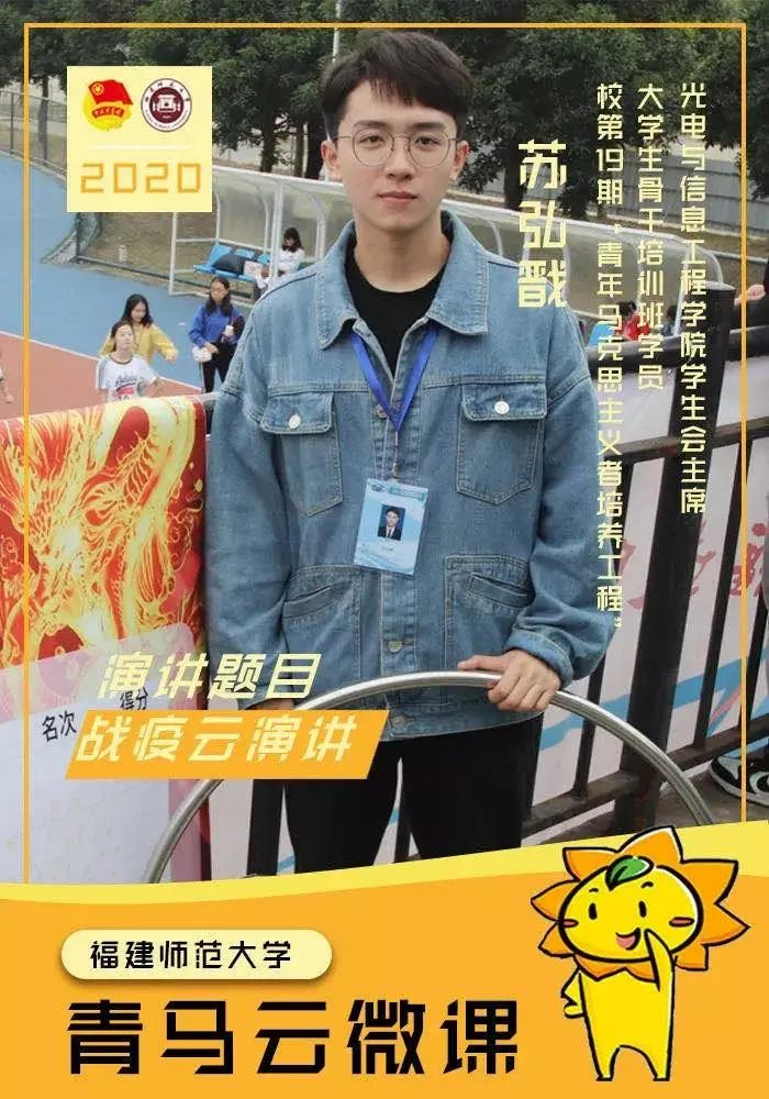 苏弘戬,男,中共党员,籍贯福建宁德,福建师范大学光电与信息工程学院2018级通信工程(中英合作)专业本科生。现任校学生会执行主席,曾任院学生会主席、年级学生会主席。