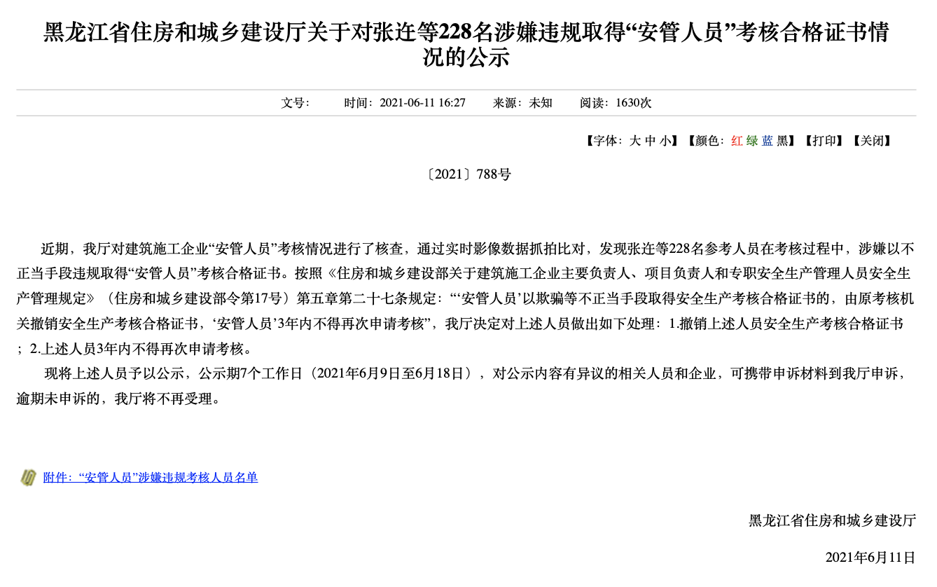 6月11日,黑龙江省住房和城乡建设厅公布一份“安管人员”涉嫌违规考核人员名单称,228名参考人员在考核过程中,涉嫌以不正当手段违规获取“安管人员”考试合格证书,按照有关规定对上述人员撤销安全生产考核合格证书。