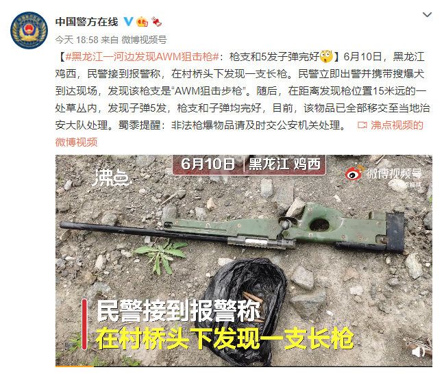 6月10日,黑龙江鸡西,民警接到报警称,在村桥头下发现一支长枪。民警立即出警并携带搜爆犬到达现场,发现该枪支是“AWM狙击步枪”。随后,在距离发现枪位置15米远的一处草丛内,发现子弹5发,枪支和子弹均完好,目前,该物品已全部移交至当地治安大队处理。警方提醒:非法枪爆物品请及时交公安机关处理。