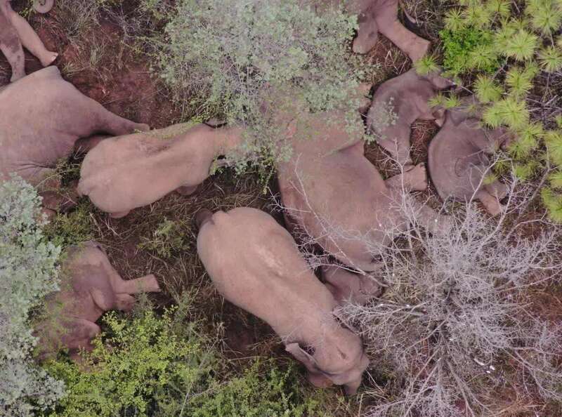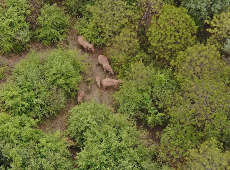 6月6日在昆明市晋宁区夕阳彝族乡拍摄的野象(无人机照片)。