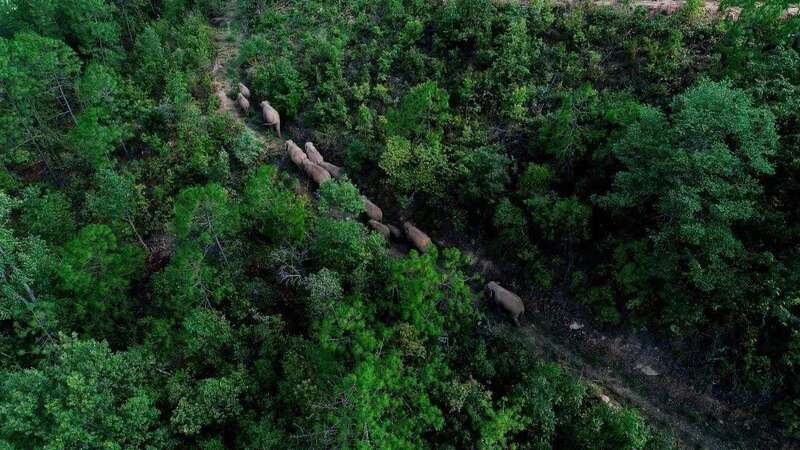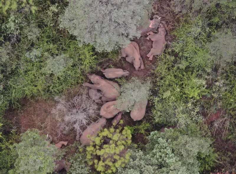6月4日在昆明市晋宁区双河彝族乡拍摄的野象(无人机照片)。