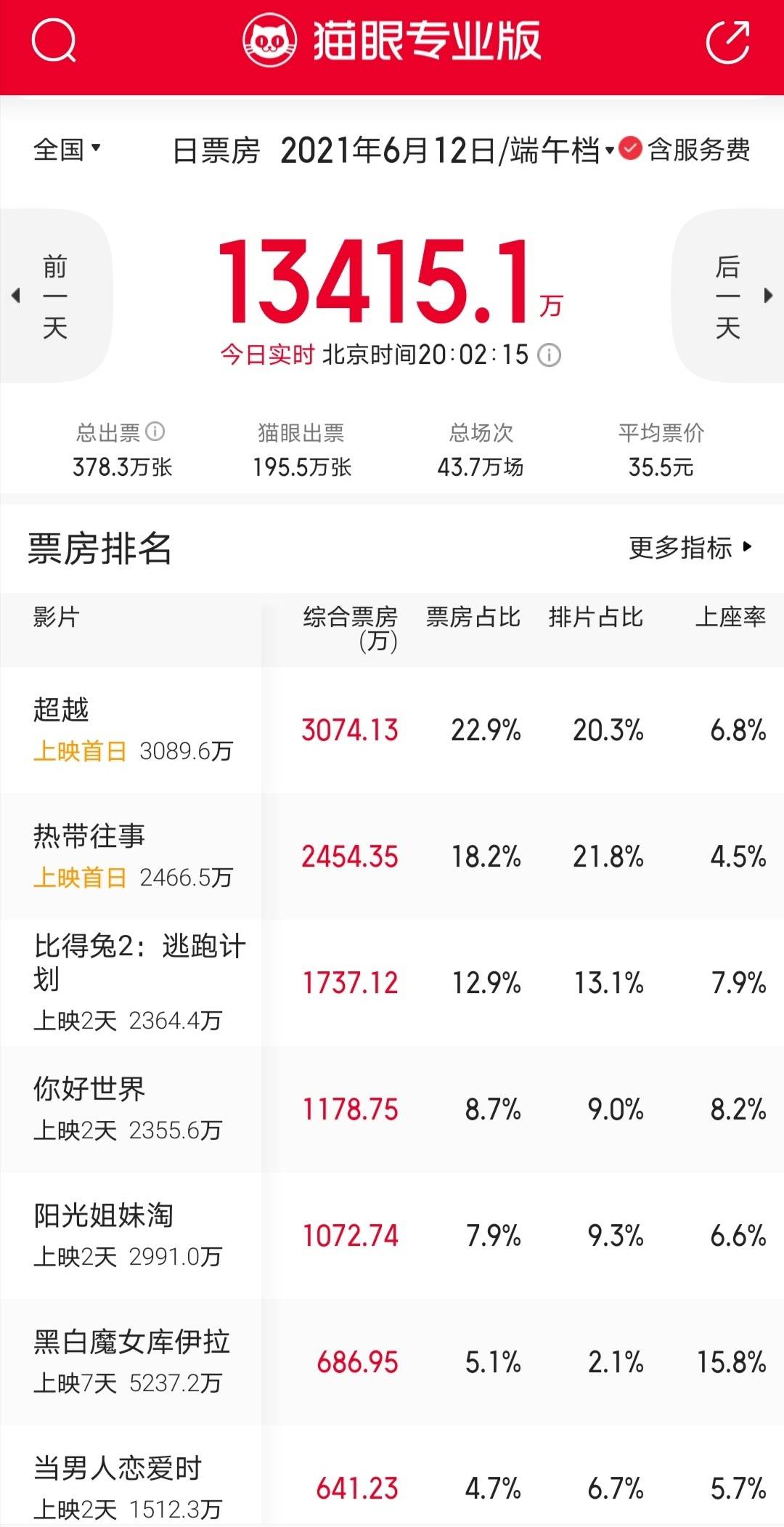 6月12日,端午小长假第一天,作为史上最拥挤的端午档,16部新片并没有提振影市信心,截至当晚8点,电影总票房1.3亿,远低于业内预期。之前有专业机构预测今年端午档的票房将过6亿,按照这个趋势恐难实现。目前当天上映新片票房冠军和亚军分别是《超越》(3149万)和《热带往事》(2519万)。目前口碑最好的是6月11日上映的《比得兔2》(豆瓣7.4分)和《你好世界》(豆瓣7.2分)。