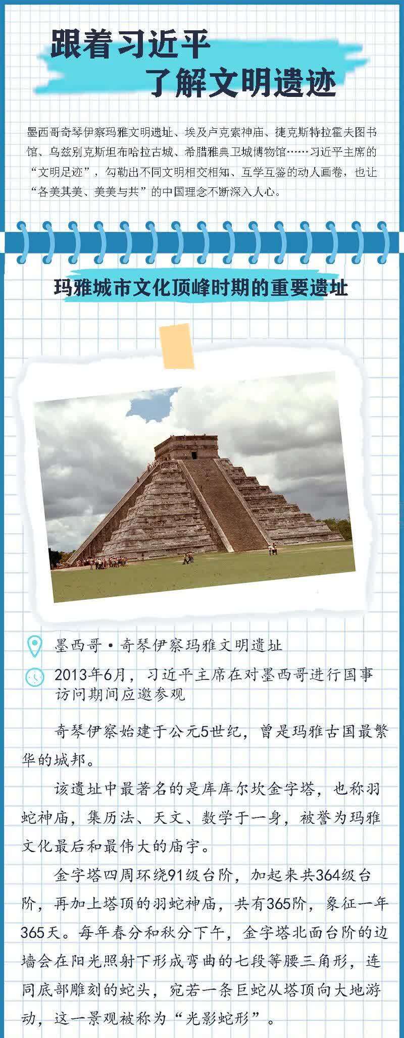 “我访问过世界上许多地方,最喜欢做的一件事情就是了解五大洲的不同文明,了解这些文明与其他文明的不同之处、独到之处,了解在这些文明中生活的人们的世界观、人生观、价值观。”近年来,从墨西哥奇琴伊察玛雅文明遗址,到埃及卢克索神庙,从捷克斯特拉霍夫图书馆,到乌兹别克斯坦布哈拉古城,习近平主席的“文明足迹”,勾勒出不同文明相交相知、互学互鉴的动人画卷,也让“各美其美、美美与共”的中国理念不断深入人心。