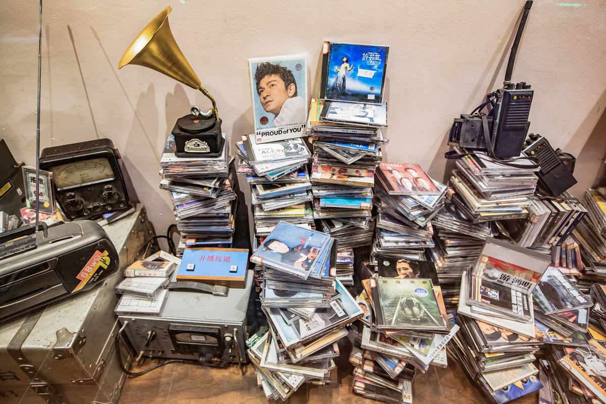 2021年6月12日,端午假期,福州M17文化广场吸引市民参观打卡。FM893福州广播二台(音乐频道)全媒体复古直播间展示的明星照片、原电台的老设备、开盘带和CD磁带。
