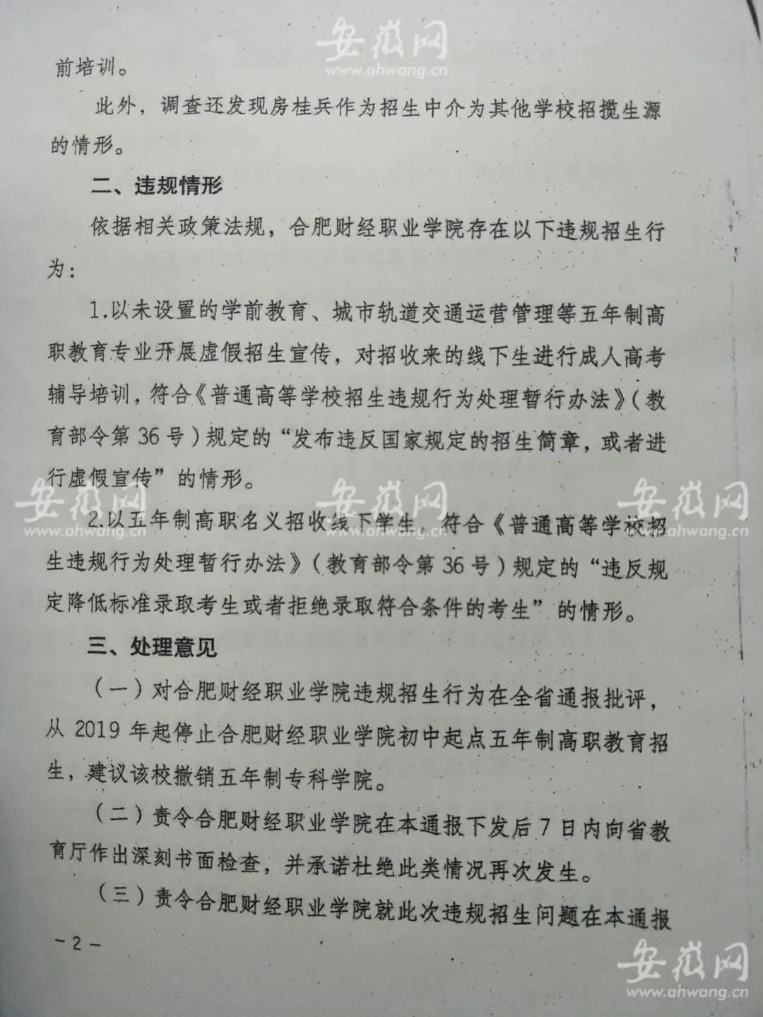 安徽省教育厅对合肥财经职业学院违规招生行为在全省通报批评,从2019年起停止合肥财经职业学院初中起点五年制高职教育招生,建议该校撤销五年制专科学院。责令合肥财经职业学院在该通报下发后7日内向安徽省教育厅作出深刻书面检查,并承诺杜绝此类情况再次发生。责令合肥财经职业学院就此次违规招生问题在该通报下发后1个月内依法依规整改到位,并做好安全稳定工作;同时举一反三,全面开展自查自纠,切实规范办学行为,并将自查和整改情况及时报省教育厅。责令合肥财经职业学院免去房桂兵五年制专科学院院长职务,对相关责任人给予相应处罚。向有关单位建议按规定撤销房桂兵铜陵市政协委员资格,并将涉嫌犯罪的问题及线索移送司法机关依法处理。