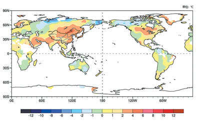 国家气候中心全球监测产品,显示今年3月全球平均气温距平空间分布情况。图中暖色代表气温偏高,冷色代表气温偏低。中国气象局供图