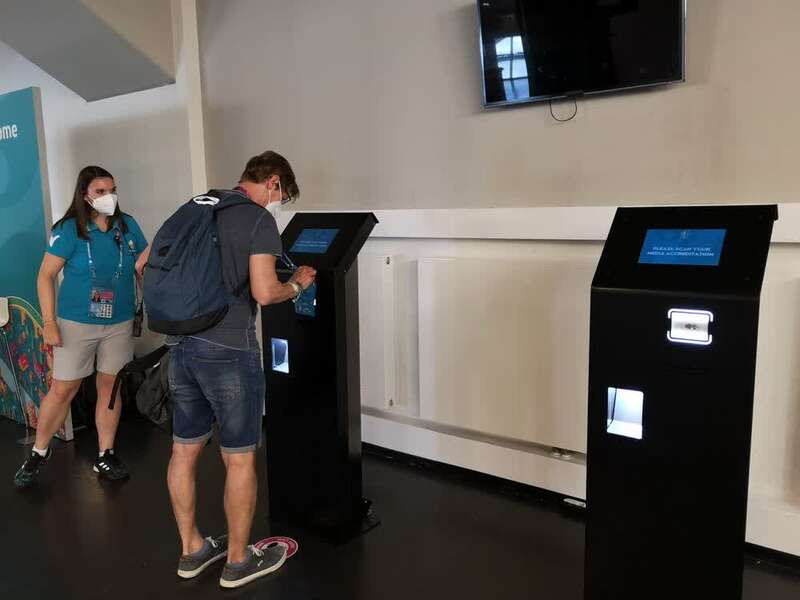 赛场媒体中心以前与新闻发布厅是一个大厅内的两块区域。记者凭证件到原媒体中心对面的接待窗口领取票证。如今,为了减少人际接触,接待处已关闭。记者通过安检后,要到新的媒体中心的自助柜机上扫码打印看台席位票。