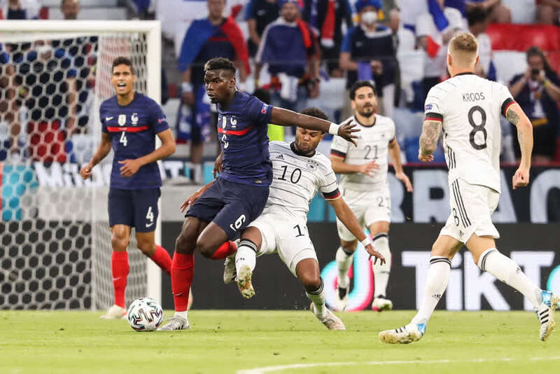6月15日,欧锦赛小组赛,法国队球员博格巴(左二)与德国队球员格纳布里(中)在比赛中拼抢。新华社记者单宇琦摄