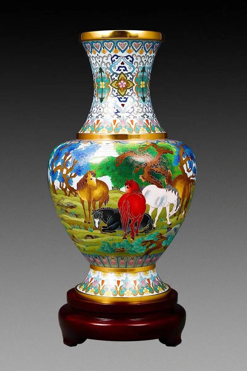 《八骏马》瓶以周代礼器青铜罍为原型创作而成,作品主题纹饰取材于著名宫廷画家郎世宁的“八骏图”,不仅从材质、工艺、绘画技法等方面在宫廷名画上实现了新的飞跃,更是中西方文化融合的艺术典范,整件作品寓意宏大、气度不凡,饱含中国文化自信,彰显新时代大国外交风采!