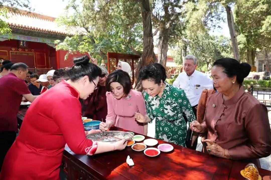 2017年5月15日,中国第一夫人邀请出席首届“一带一路”国际合作高峰论坛的外方团长配偶参观世界文化遗产——故宫博物院。在御花园北京“非物质文化遗产”项目展示区,各外方团长配偶与国家级非遗传承人钟连盛等亲切交流,并亲自在景泰蓝《和平颂宝鉴》上点蓝,向世界展示了景泰蓝艺术的超凡魅力。