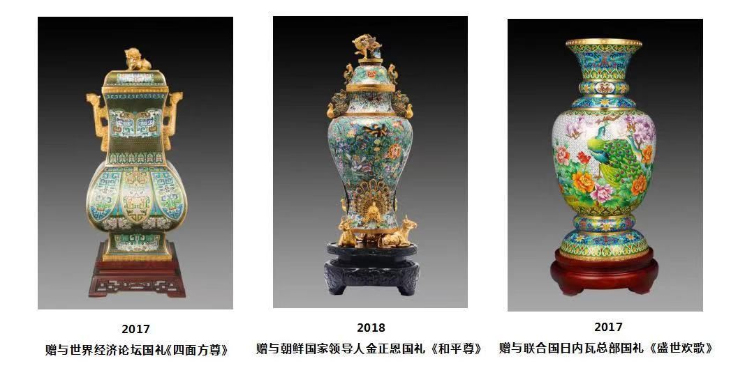 近年来,景泰蓝屡屡耀目世界,钟连盛作为国宝级景泰蓝国大师,其作品更是代表了当代景泰蓝技艺的最高水准,被国家领导人选为国礼赠与外国元首和国际机构,正如我们今天所看到的《四面方尊》、《和平尊》、《盛世欢歌》等景泰蓝作品,随着中国在全球国际地位的不断提高,作为中国大国外交中的国礼重器在世界舞台上大放异彩,如今已成为一张响当当的中国名片!