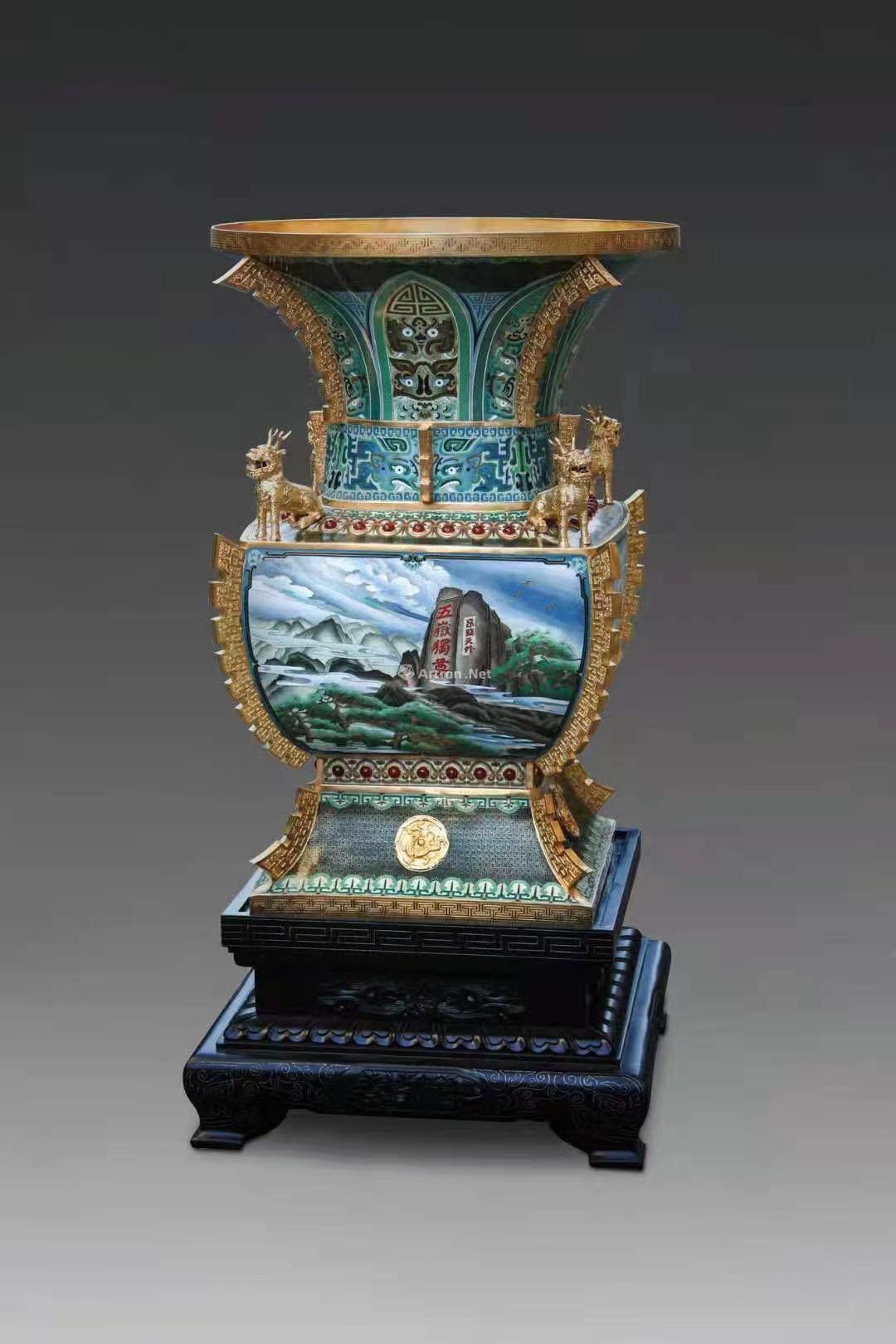 钟连盛大师景泰蓝作品紧扣时代脉搏,唱响时代主旋律,心系祖国发展,内容含蓄而深邃,展现了当代景泰蓝艺术创作的无穷灵感与巧思。这件《华夏盛世尊》创意灵感源于商周青铜经典器型尊,上圆下方,象征天圆地方,和谐幸福,江山永固。整件作品以皇家名贵釉色松石蓝釉为底色,长颈、高足、颈部高耸。以长城为棱,福佑国泰民安,上下两圈各镶嵌28颗红宝石,共计56颗,象征着56个民族上下同心,四周装饰有蕉叶纹、如意纹、长城纹、回形纹和兽面纹等国宝纹路,尊四角各塑麒麟镇守四方,腹部四面分别以泰山、黄河、长城、长江立于东西南北四个方向。底部以四方瑞兽青龙、白虎、朱雀、玄武纹路为饰,代表春夏秋冬,福佑人民生活团结和睦、和平宁静。《华夏盛世尊》传达了对祖国繁荣昌盛、国泰民安、基业永固的美好祈盼。