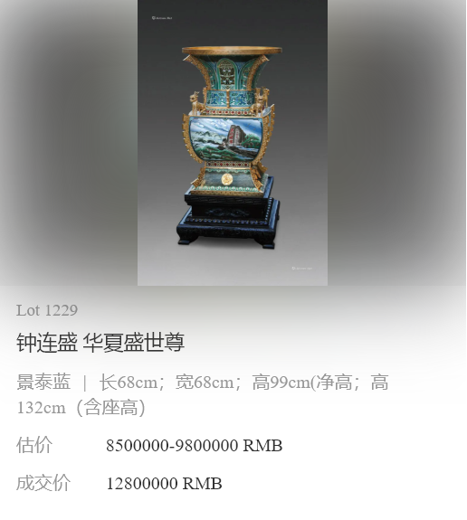 2021年5月30日,中国工艺美术大师钟连盛景泰蓝代表作《华夏盛世尊》在香港威廉2021年春季艺术品拍卖会中,经过多轮激烈竞价最终以1280万元成交,再创个人最高拍卖纪录。