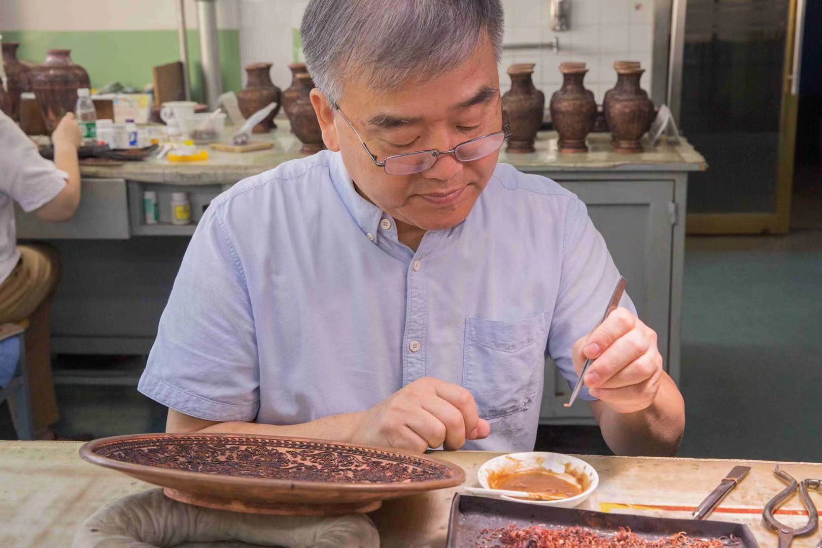 毕业后,钟连盛被分配到了工厂,从最脏最累的手工环节干起,有人为“高材生”感到惋惜,可他丝毫没有大材小用的不平衡,反而觉得实践是自己急需补上的一课。钟连盛是第一批通过专业学习,并且懂绘画、懂设计、懂技术的专业人才,正是他们担负起了景泰蓝复兴和创新的重任。