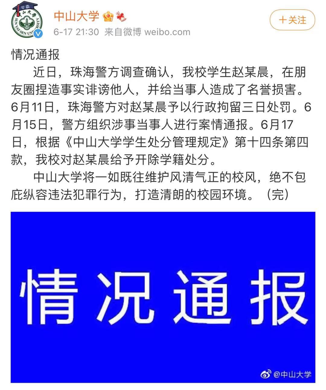 6月17日晚,@中山大学发布情况通报,近日,珠海警方调查确认,该校学生赵某晨,在朋友圈捏造事实诽谤他人,并给当事人造成了名誉损害。6月11日,珠海警方对赵某晨予以行政拘留三日处罚。6月15日,警方组织涉事当事人进行案情通报。6月17日,根据《中山大学学生处分管理规定》第十四条第四款,中山大学对赵某晨给予开除学籍处分。