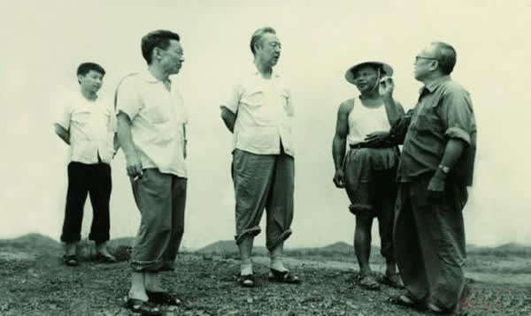 1978年8月,习仲勋(左三)在广东惠阳农村调研。习近平(左一)利用暑假时间参加社会实践活动,随同父亲一起下乡。