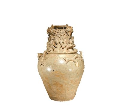 青釉堆塑楼阁人物鸟兽谷仓罐