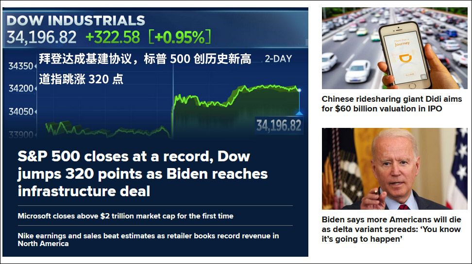 本周三晚间,参议院多数党民主党领袖舒默和众议院议长、民主党人佩洛西同白宫官员会晤,两名国会领袖都暗示会支持跨党派的基建框架。白宫称,两人都同意拜登不对年收入低于40万美元的国民加税的呼吁。
