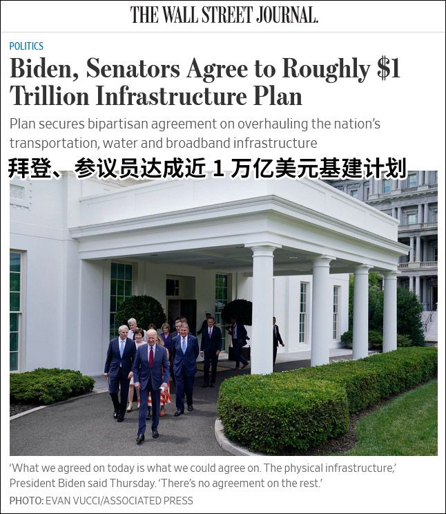 这份基建方案的框架协议得到了11名共和党参议员以及10名民主党参议员的支持,可能在民主党把持的参议院赢得通过议案所需的至少60票支持。
